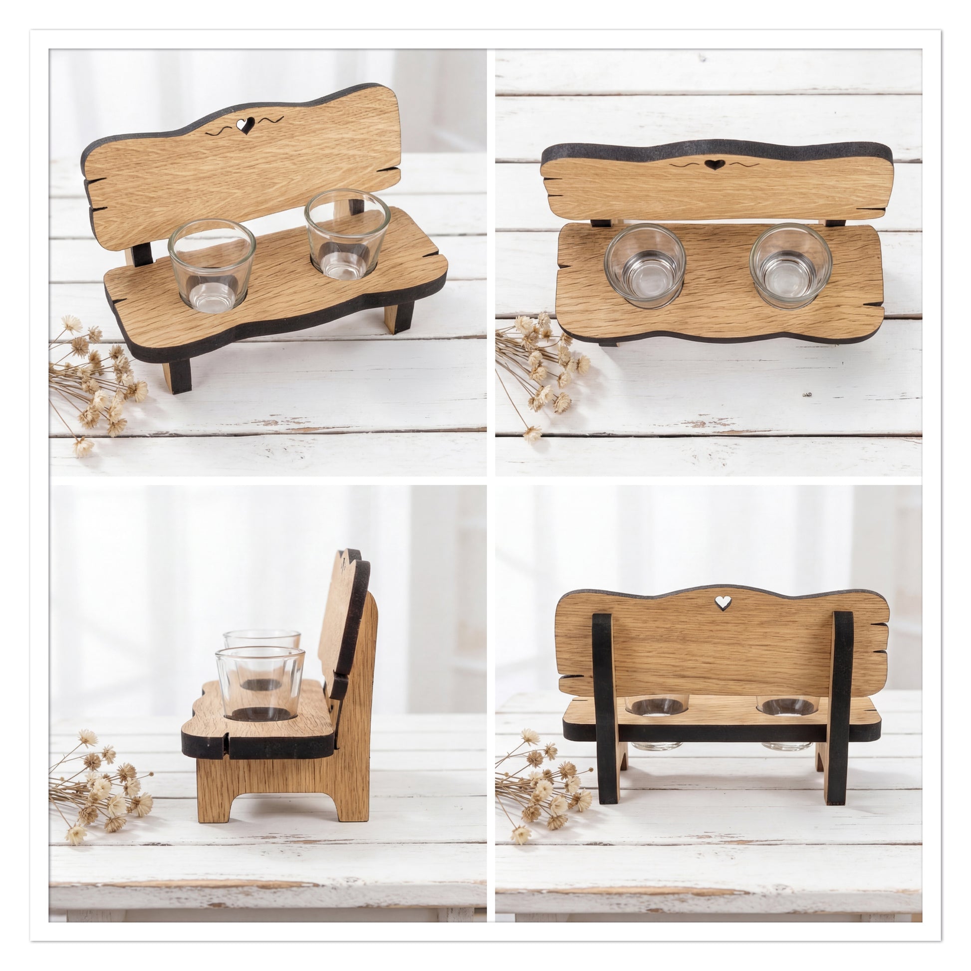 Die kleine Bank enthält zwei Schnapsgläser und eignet sich perfekt, um gemeinsam anzustoßen.