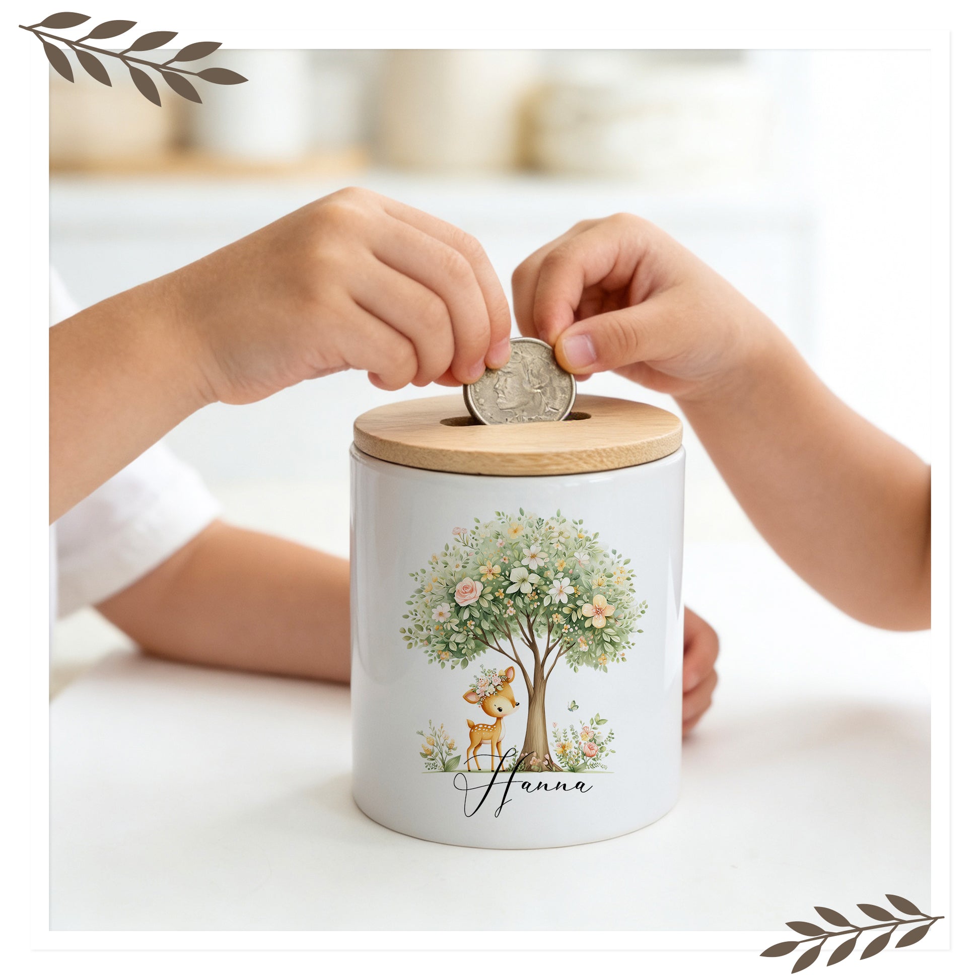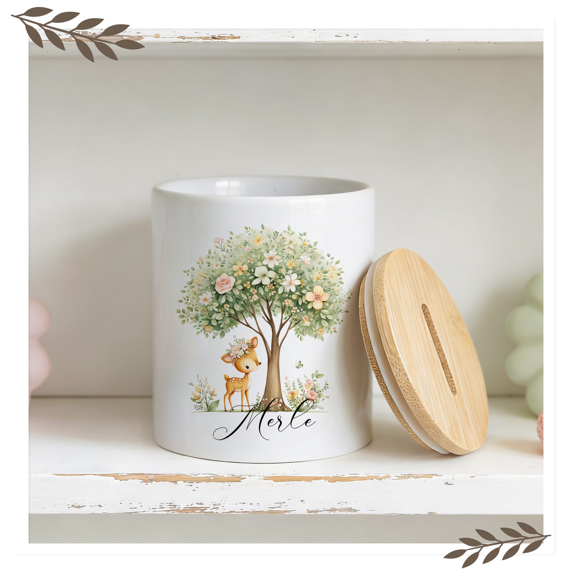Diese wunderschöne Kinder-Spardose aus Keramik ist ein ganz persönlicher Begleiter für die ersten kleinen Sparziele. Verziert mit einem zarten Reh-Motiv unter einem blühenden Baum und dem individuell personalisierten Namen, wird sie schnell zu einem Lieblingsstück im Kinderzimmer.