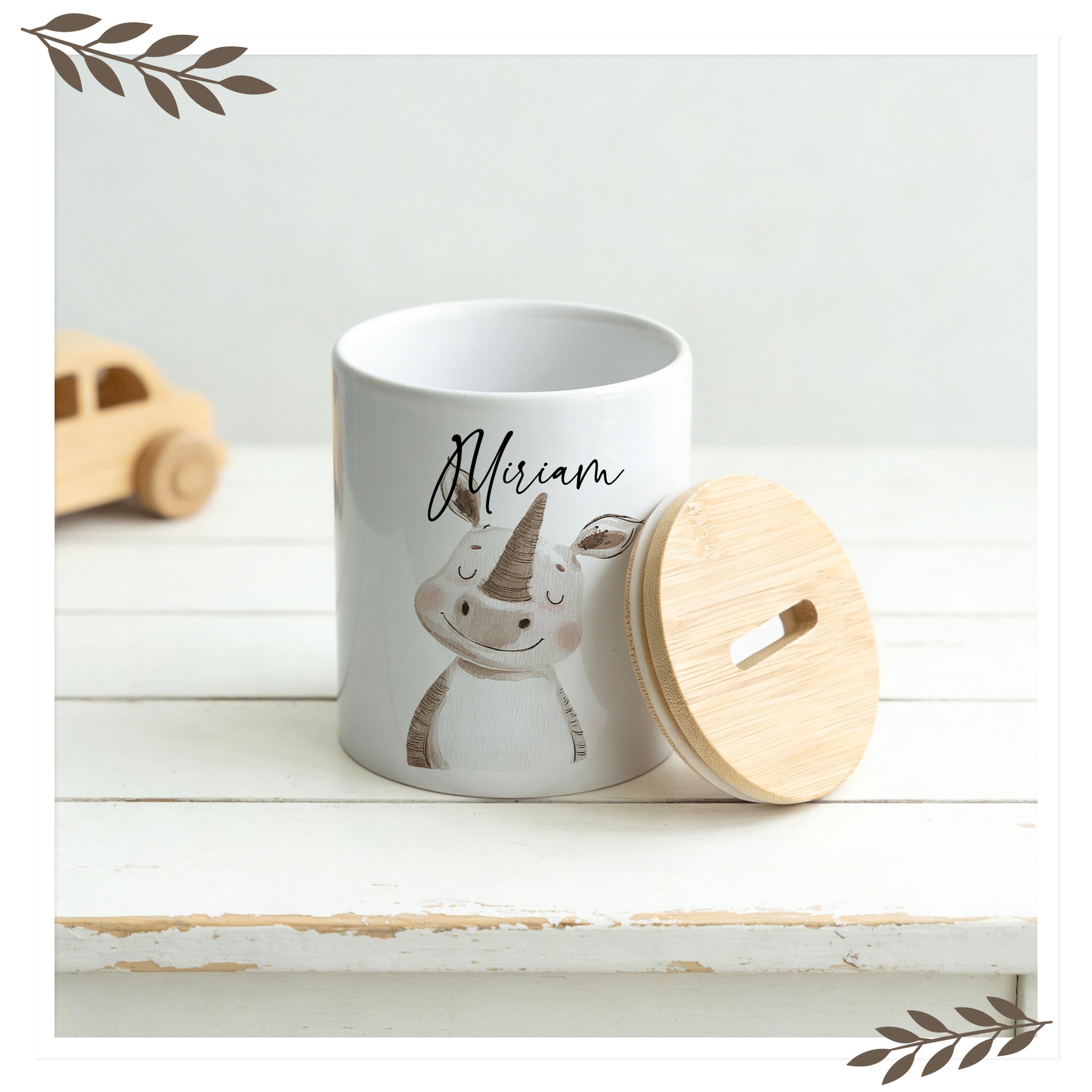 Die Kombination aus hochwertiger Keramik und einem natürlichen Bambusdeckel mit Einwurfschlitz verbindet modernes Design mit kindlicher Wärme. Durch den beidseitigen Druck ist das Motiv von allen Seiten sichtbar – perfekt als dekoratives Highlight im Baby- oder Kinderzimmer.