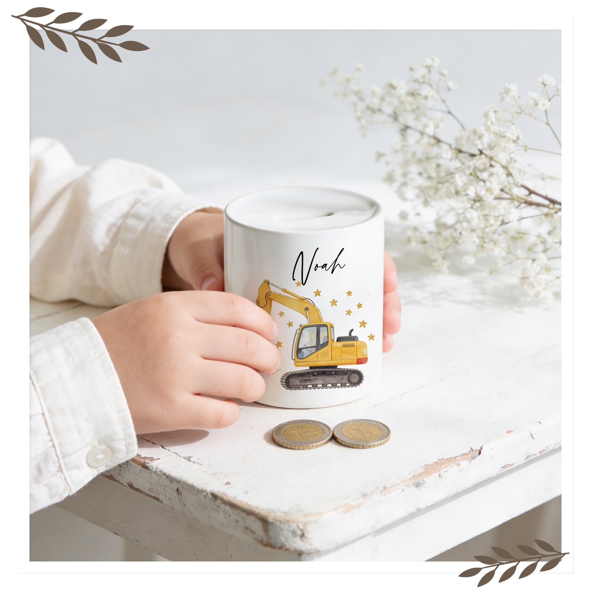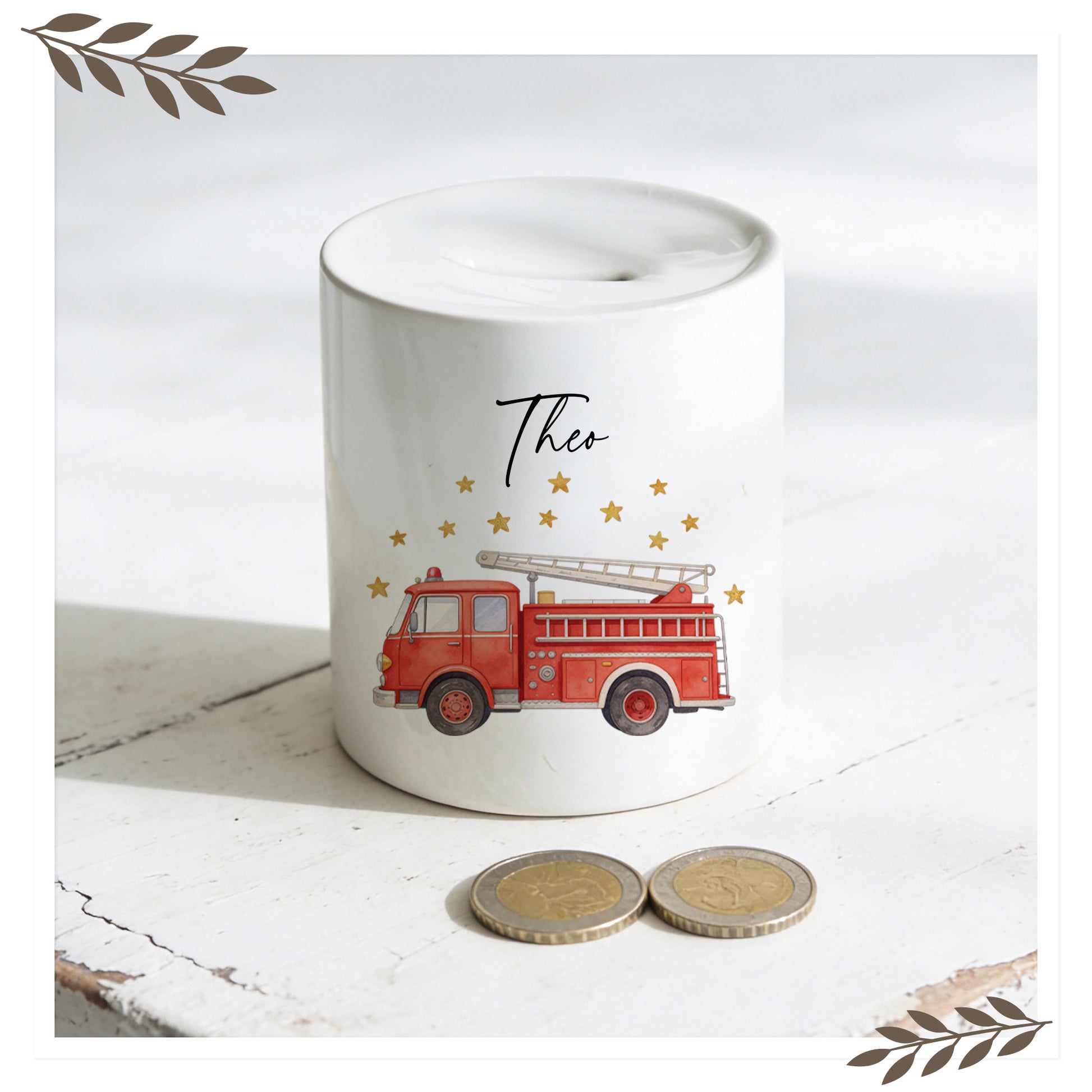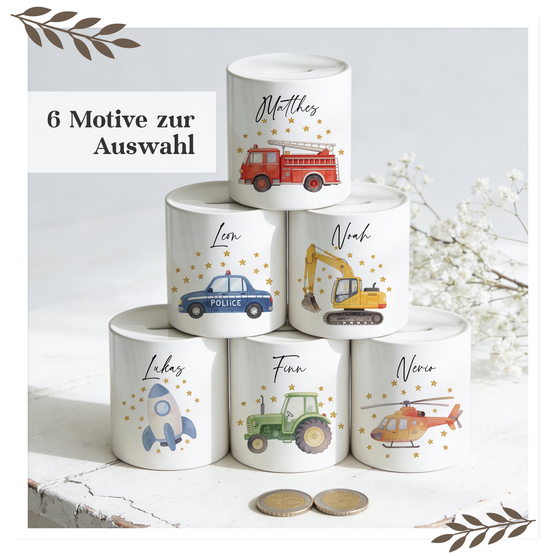 Jede Spardose wird mit dem Wunschnamen deines Kindes versehen und mit einem kindgerechten Fahrzeug-Motiv gestaltet – perfekt für kleine Feuerwehr-Fans, Baustellen-Entdecker oder zukünftige Piloten 🚒🚜🚀