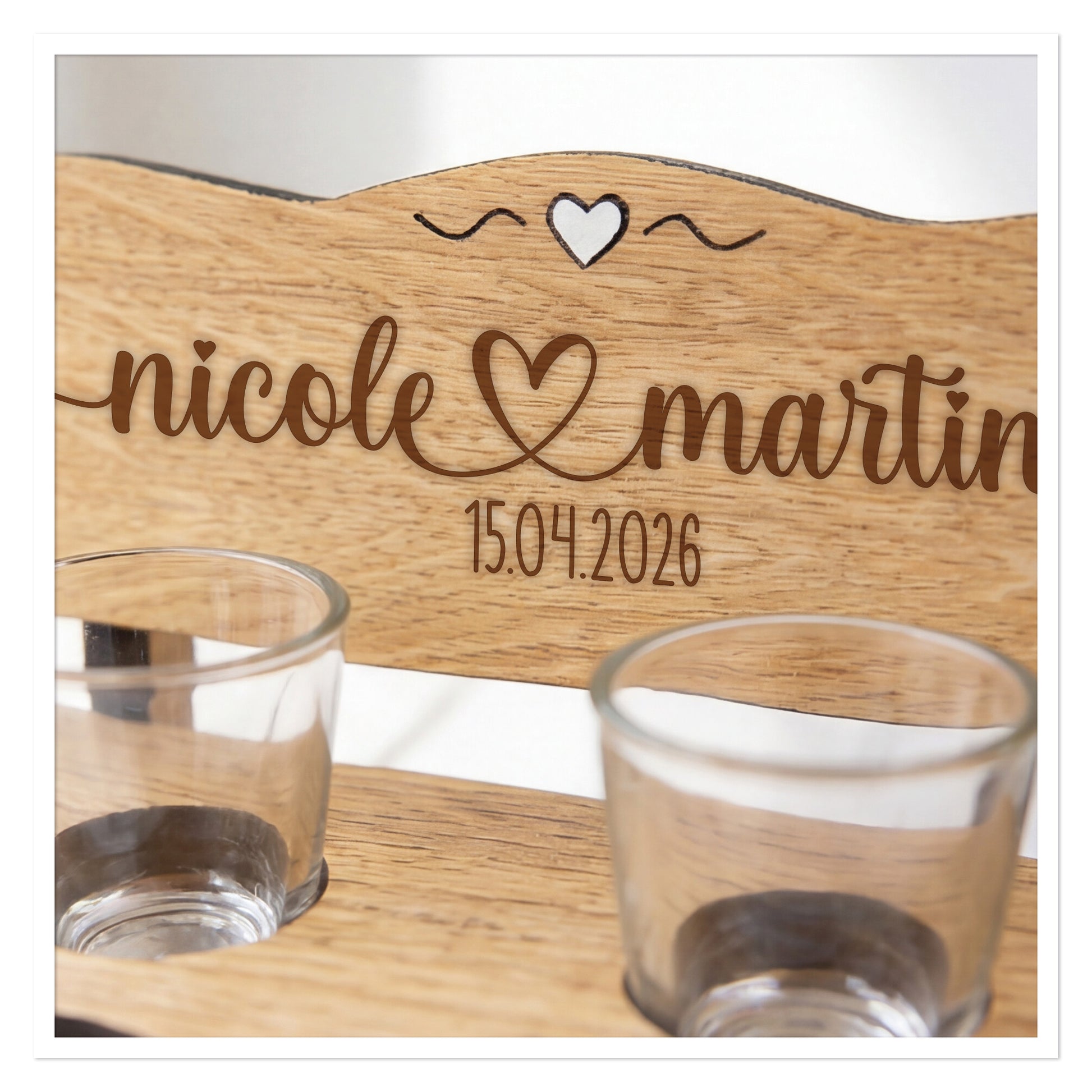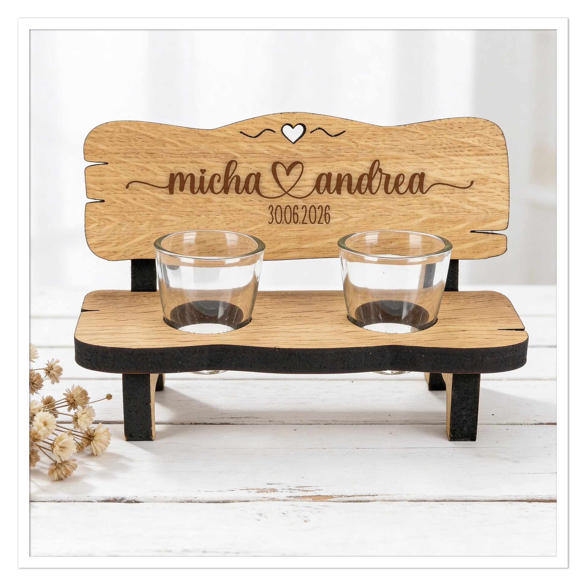 Diese personalisierte Schnapsbank aus Eichenholz ist ein liebevolles Geschenk für Paare.