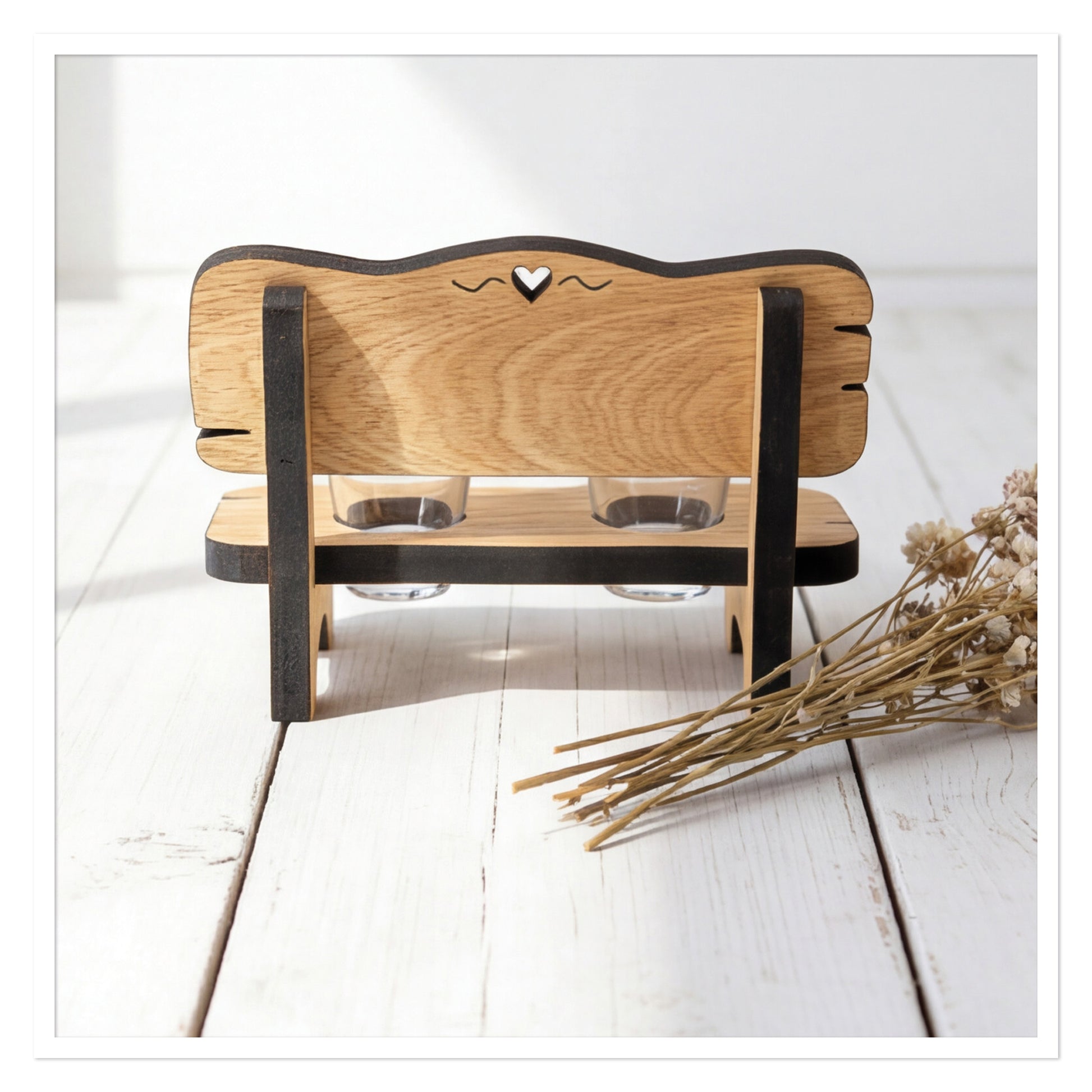 Die kleine Bank enthält zwei Schnapsgläser und eignet sich perfekt, um gemeinsam anzustoßen.