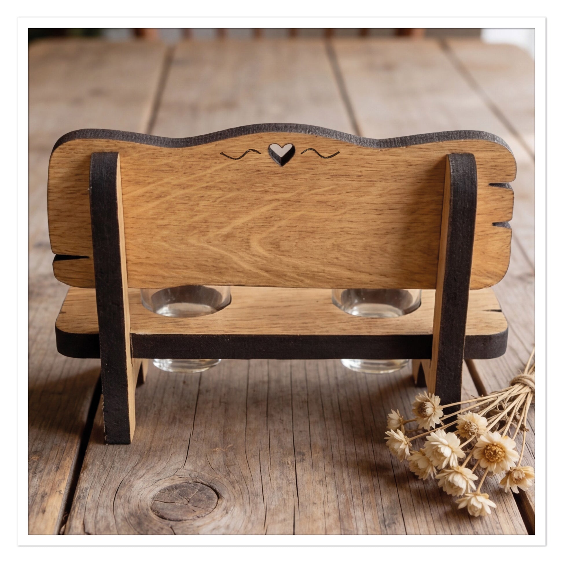 Die kleine Bank enthält zwei Schnapsgläser und eignet sich perfekt, um gemeinsam auf die bevorstehende Hochzeit anzustoßen.