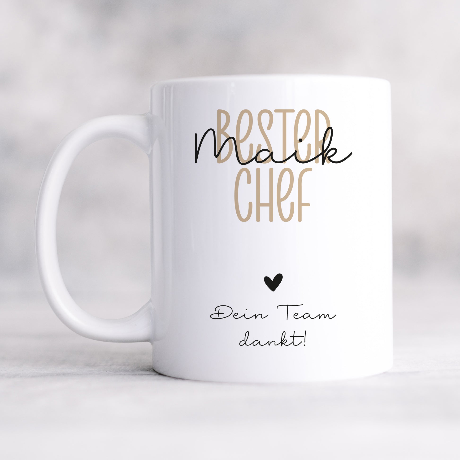 Die moderne Typografie, klare Linien und liebevollen Details machen diese Keramiktasse zu einem täglichen Begleiter – vom ersten Kaffee am Morgen bis zur Besprechung am Nachmittag. Durch die Personalisierung entsteht ein einzigartiges Geschenk, das zeigt: Wertschätzung kann man trinken.