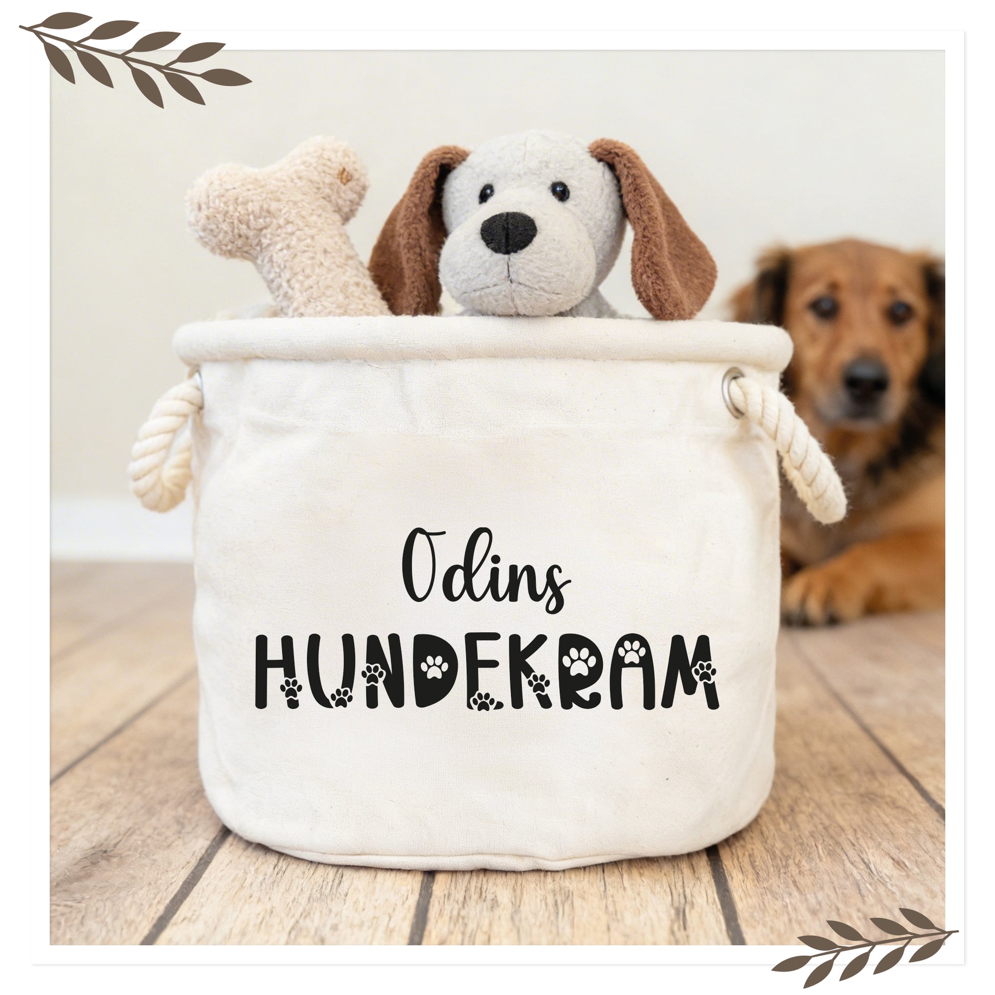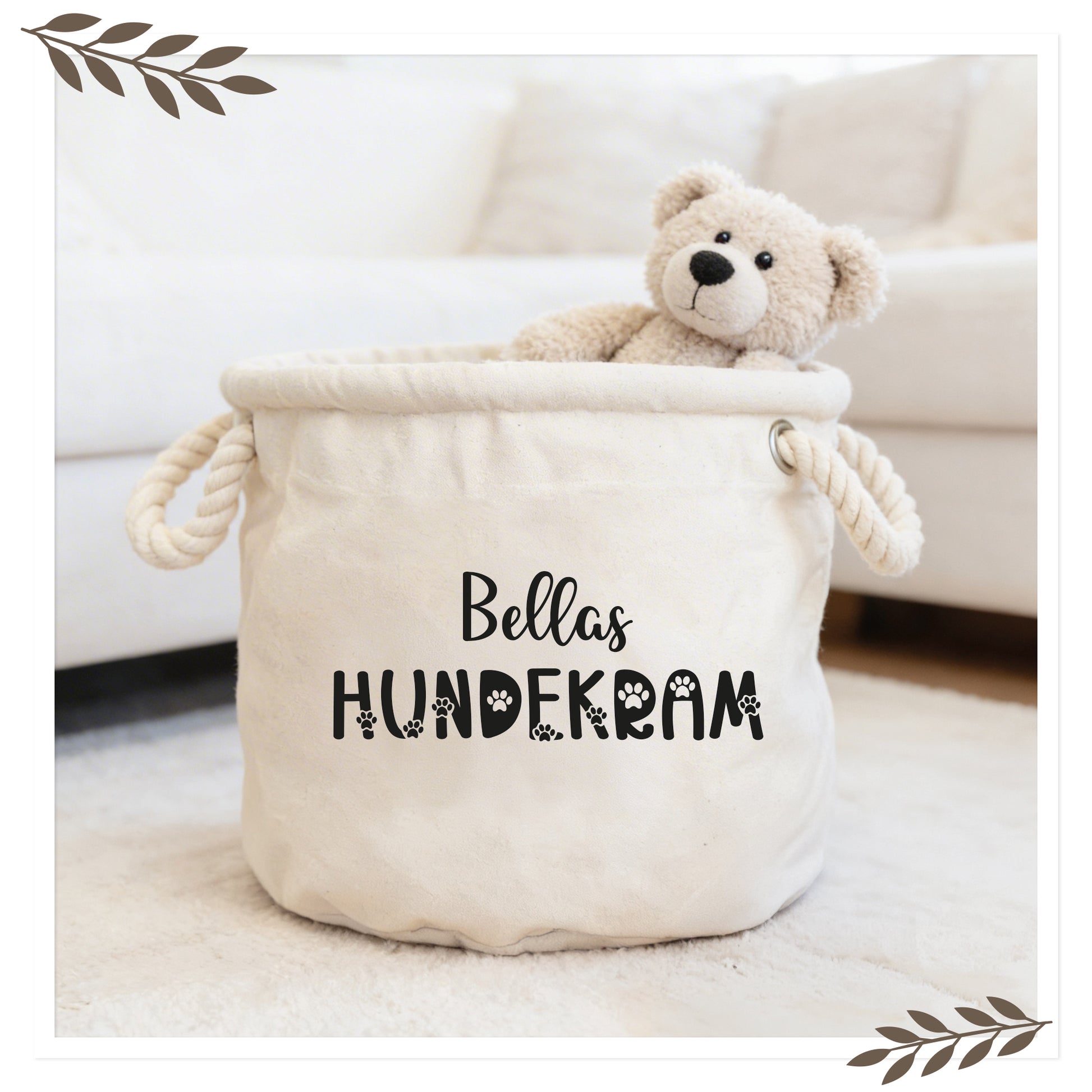 Dieser personalisierbare Aufbewahrungskorb für Hundespielzeug sorgt für Ordnung und sieht gleichzeitig stilvoll aus. Spielzeuge, Leinen oder kleine Decken lassen sich praktisch verstauen und sind jederzeit griffbereit.