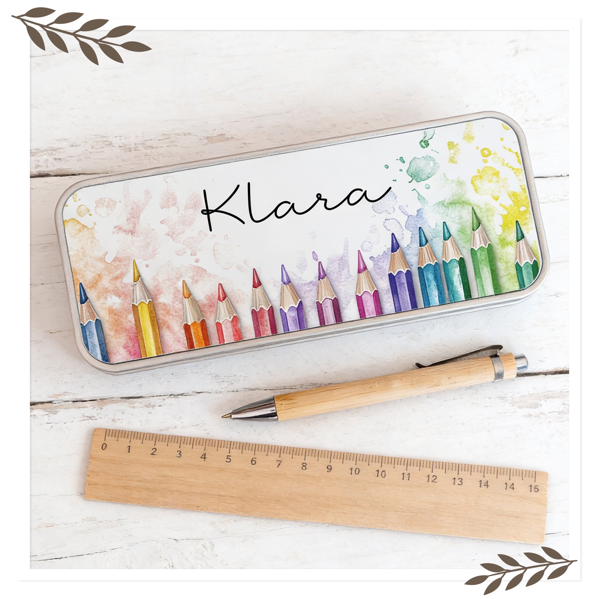 Stiftebox aus Metall mit Wunschname - Design Buntstifte